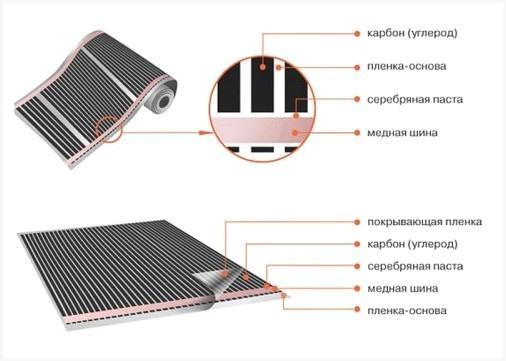 В первом варианте роль нагревательных элементов делает карбоновое волокно (углеродная паста с различными добавками). База материала – лавсановая пленка, владеющая такими качествами как: износоустойчивость, прочность, эластичность и хорошие диэлектрические характеристики.