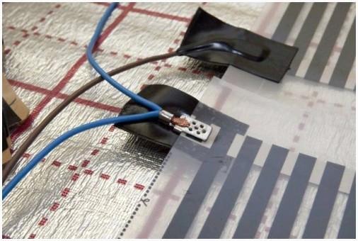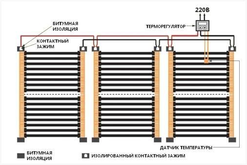 Греющие элементы запаяны в два слоя, подача электроэнергии осуществляется через бронзовые либо серебряно-бронзовые проводники. Подключение теплого пола происходит по параллельной схеме.