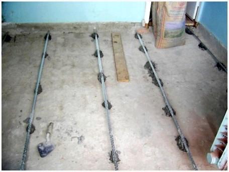 - В случае если основание подготовлено верно, имеет ровную поверхность и нужную высоту, то направляющие. В будущем их вынимают из стяжки, а оказавшиеся канавки заполняют раствором и сглаживают.