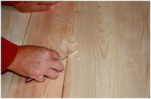 Второй способ. Между скрипящими досками просверлить отверстие под углом 45° толщиною 6-8 мм. В отверстие забить деревянный штифт, смазанный столярным клеем. Выступающую часть штапика срезать стаместкой, ремонтируемый участок шпатлюется.