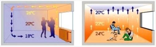 - Равномерное распределение тепла. Теплый воздушное пространство в соответствии законам физики поднимается вверх, а внизу появляются «карманы» холодного воздуха. Так, стандартные радиаторы отопления прогревают потолок. Использование теплого пола содействует накоплению теплых масс воздуха в нижней плоскости помещения.