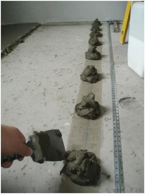 Принципиально важно! Контролируем строго горизонтальное размещение направляющих посредством уровня и нивелира. Заливать пол бетоном возможно будет по окончании того, как «плюшки» достаточно затвердеют, дабы при нажатии на «маяк», они не продавились.