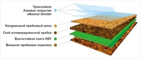— пробковый ламинат/пробковый паркет/пробковый плавающие полы – это вариант замкового соединения при укладке пробковых полов. Ламель пробкового ламината имеет форму и размеры стандартной ламели ламината, но следующее строение: база из древесно-волокнистой плиты, на которую клеится техническая пробка, с обеих сторон (с верхней и нижней стороны плиты), а с верхней, лицевой, стороны, дополнительно, на техническую пробку – шпон коры пробкового дерева, слоем в пара миллиметров, покрытого особым защитным лаком.