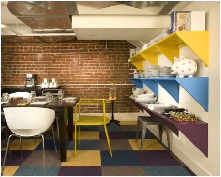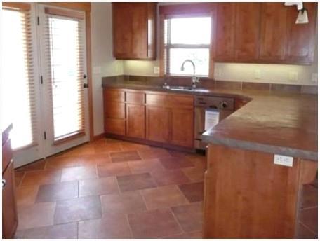— надёжный вариант пола: кроме того при наличии воды на полу – поверхность пола не скользит, а посуда при падении не оглушит соседей и, вероятнее, не разобьется.