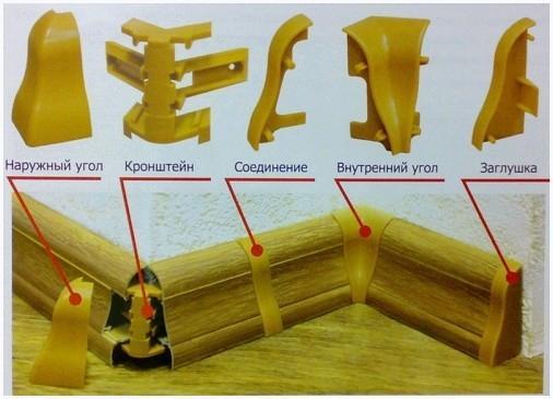 В случае приобретения пластиковых планок, не считая самого напольного плинтуса, вам пригодятся соединительные элементы (каждые 2,5 метра), торцевые левые и правые заглушки, внешние (в случае если имеется в комнате) и внутренние уголки. Вся фурнитура для установки напольного плинтуса обязана кроме этого быть из одной партии, на конечный случай — от одного производителя. В обязательном порядке все стыковые элементы должны соответствовать цвету плинтуса. При выборе фурнитуры удостоверьтесь в надежности стыковку планки плинтуса с углами и соединителями: не должно появляться щелей и зазоров, плинтус должен входить легко.
