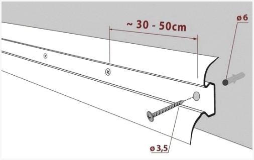 Разметку комнаты неизменно необходимо затевать от угла либо двери. Возьмите планку плинтуса и установите на неё заглушку либо угол, приложите её к углу комнаты, прижав пальцем, отступите в сторону окна 5-6 сантиметров: тут будет размешаться первое отверстие, отметьте это место. В случае если в вашей комнате идеально ровные стенки, следующее отверстие будет находиться на расстоянии 40-45 сантиметров.