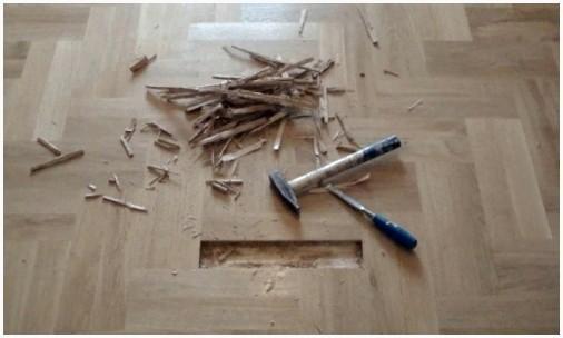 Реставрация покрытия в этом случае будет заключаться в следующем. Расколите рассохшуюся дощечку стамеской либо долотом на пара кусков. Потом необходимо их вынуть, начиная с середины, и удалить клеевую базу. Впадину, что осталась по окончании удаления паркетины, необходимо шепетильно зачистить, бережно выровняв основание.
