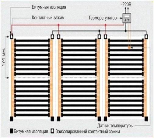 - Размещение полос делают контактами к терморегулятору, для уменьшения длины проводов в ходе соединения окончаний с аппаратом.
