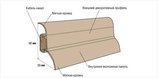 Разглядывая особенность внутреннего строения аналогичных плинтусов, направляться подчернуть, что в полости для того чтобы изделия присутствует дополнительное пространство для прокладки разнообразных кабелей и проводов – сетевых, кабельных, телефонных, силовых и сигнализационных.