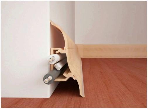 Как правило такие плинтуса изготавливаются из синтетических материалов, по причине того, что достаточно проблематично выточить в цельном бруске полость под провода. Само собой разумеется, все быть может, и такие модели создают под конкретный заказ, но цена деревянных плинтусов с кабель каналом высокая. А в случае с пластиком все работы проводятся значительно несложнее.