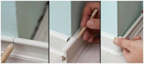 Установку плинтусов с кабель каналом начинают с угла комнаты. Работы возможно затевать с любого угла помещения, но оптимальнее начать с угла наиболее долгой прямой стенки. Не забывайте, что начиная работу таким методом, будет употребляться предельное число целых хлыстов, а отрезанным останется лишь один кусок, который отправится в будущем на установку в ниши, обводку опорных колонн и маленьких участков стенки. В следствии для того чтобы приёма вы получите к концу работы предельное число обрезков и сэкономите деньги на стройматериале.