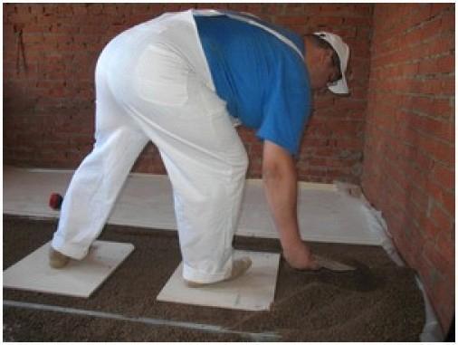 - По подготовленным направляющим засыпается керамзит и разравнивается правилом либо широким шпателем. Данные работы проводятся в респираторе из-за громадного объема пыли;