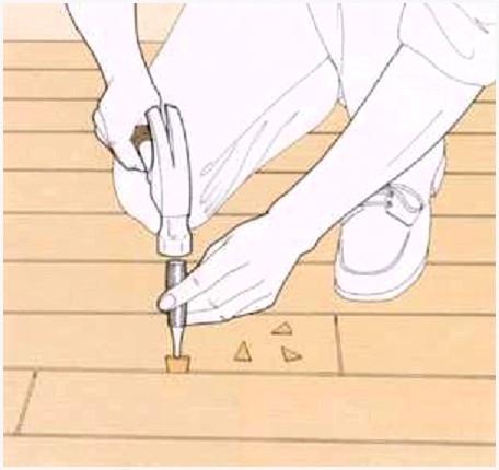 Также возможно воспользоваться и таким способом: между скрипящими половицами просверлить отверстие под углом 45 градусов и вбить в него деревянный штифт, намоченный в столярном клею. Под давлением штифта плашки разойдутся и больше не будут соприкасаться между собой. Скрип закончится.