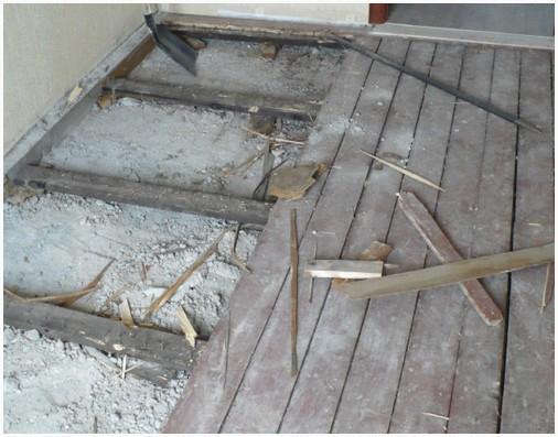 - Всецело убрать старое напольное покрытие, снять доски и лаги деревянного пола