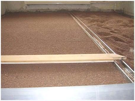 Засыпка осуществляется по маякам, каковые в будущем убирают. Она равномерно распределяется по полу и шепетильно утрамбовывается. Целесообразно засыпать маленькими участками, дабы избежать возможности предстоящего искривления напольного покрытия из-за неравномерной осадки.