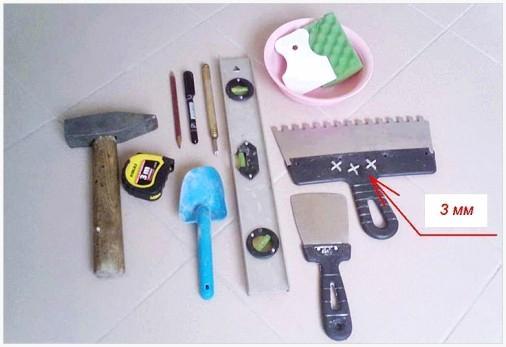- Несложный и зубчатый шпатель, и резиновый мастерок;