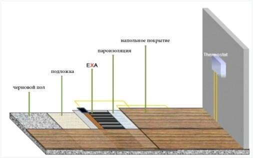 Устанавливая пленочный теплый пол для бани, кладут на основание теплоотражающий материал, к примеру, изолон. На него раскладывают составные элементы системы, а сверху помещают полиэтиленовую пленку. Она нужна для гидроизоляции нагревательных элементов. И монтируют на финише напольное покрытие.