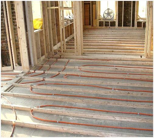 Из деревянных плит сооружают маленькие полосы, протяженность каждой не более 18 см. Они укладываются на пол, выполненный из дерева. В промежутки между полосами монтируют трубопровод, а потом посредством шурупов фиксируются теплораспределители. По окончании монтажа труб, поверхность пола покрывается посредством полиэтиленовой пленки, потом устанавливается пол из гипсоволокнистых страниц, каковые распределяют температуру в подпольном пространстве. Именно на них крепится основная отделка.