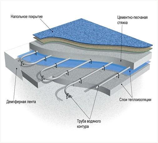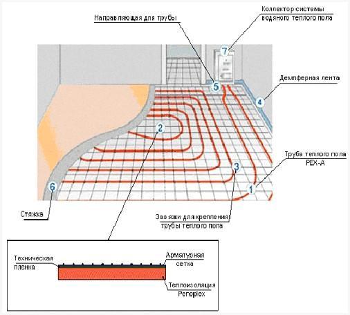 Система теплого водяного пола складывается из трубопровода и узла смешивания теплового носителя. Для трубопровода направляться отдавать предпочтение трубам, имеющим большой уровень теплопроводности, помимо этого, они должны различаться гибкостью и иметь маленькое сопротивление. Для заливки трубопровода употребляется цементная стяжка — в систему узла смешивания теплового носителя входит насос, термостатический смеситель и коллектор.
