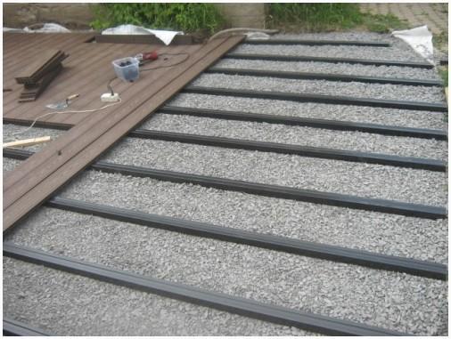 - Лаги композитные располагают в 30-40 см друг от друга. Опоры из для того чтобы материала рекомендованы для монтажа в непростых климатических условиях, но при низких эксплуатационных нагрузках (домашний стандарт). Укладка не должна производиться конкретно на грунт либо цементное основание, между лагами и поверхностью устанавливаются подушки из плотной резины;