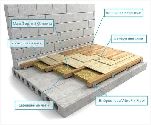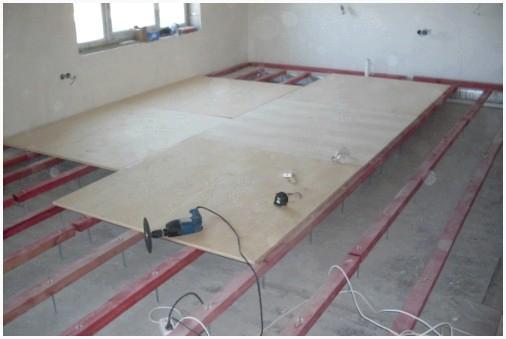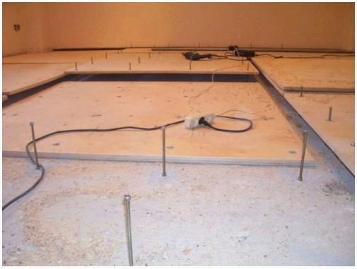 - Сперва анкерные шпильки забивают в цементное основание. На них накручивается гайка с шайбой. Высота гайки выставляется по лазерному уровню. Сейчас на анкера укладываются страницы фанеры. Лишнюю длину стержней срезают. Сейчас возможно настилать второй слой фанеры с таким расчетом, дабы верхние плиты перекрывали собою стыки нижних плит.