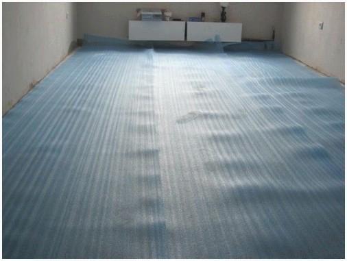 - Промежуток между направляющими ориентировочно должен быть равен их ширине. Поверх них, начиная с дальнего конца комнаты, настилается слой пароизоляции.