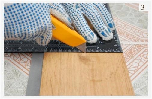Плитку возможно резать посредством канцелярского ножа, но так как лезвия будут быстро тупиться, под рукой рекомендуется иметь запасные. Делается это так: прорезается верхний слой плитки, позже по линии прореза материал надламывается и с обратной стороны дорезается. Вероятна прирезка виниловой плитки по изготовленным предварительно лекалам.
