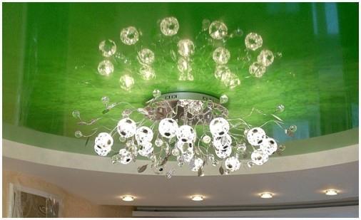 Зеленый натяжной потолок формирует гармоничную атмосферу и успокаивает. Это цвет весны и природы, который подойдет для гостиной и для спальни.
