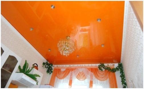 Оранжевый натяжной потолок есть красивым решением для громадных комнат. данный цвет поднимает настроение и радует.
