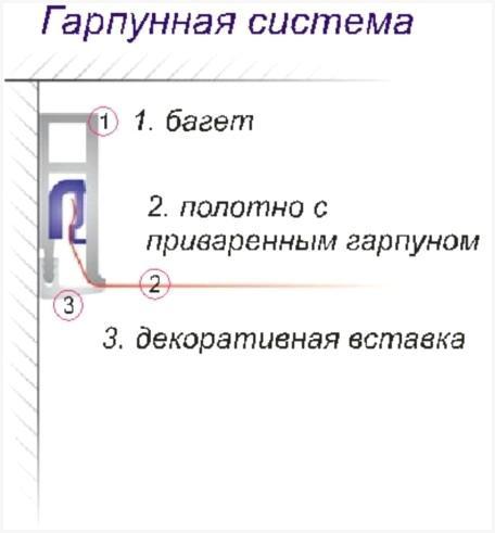К стенкам помещения по периметру крепится багет, в который будет заправляться гарпун полотна. Перед монтажом натяжного потолка помещение прогревается тепловой пушкой, после этого прогревается само полотно и натягивается, гарпун заталкивается в багет особым шпателем. Там он прочно удерживается самой конструкцией багета.