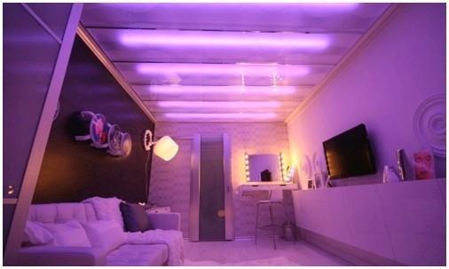 - Немного поднять стенки и низкий потолок окажет помощь подсветка, что установлена на уровне пола.