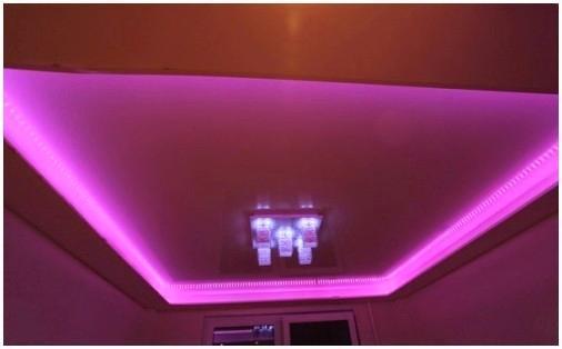 Фактически саму установку светодиодной ленты для подсветки натяжного потолка выполняют в таковой последовательности. Снимите защитный слой бумаги и наклейте бережно ленту на карниз. Уделите особенное внимание стыкам двух участков светодиодной ленты. Многие мастера довольно часто допускают ошибки на данном этапе работы, в следствии чего заметны световые провалы.