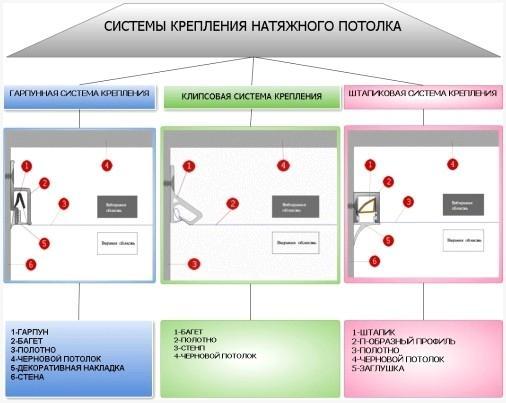 - Крепление при помощи пластиковой клипсы используют лишь для бесшовных тканевых полотен. Таковой потолок относительно легко разбирается.