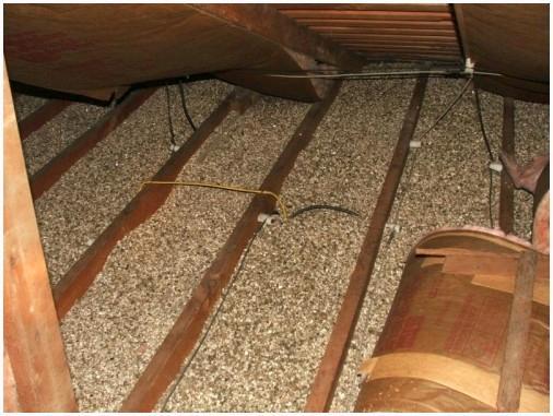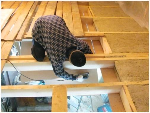 - К моменту подготовки смеси потолок уже должен быть готов к утеплению. Для этого с чердака демонтируют пол, вычищают весь обьем между лагами и обрабатывают деревянные элементы конструкции особыми составами. На дно укладывается единым полотном плотная пленка. Нахлесты проклеиваются.