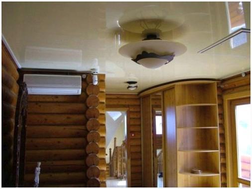 - Этими же преимуществами владеют и натяжные потолки, каковые, не обращая внимания на неестественное происхождение, гармонично вписываются в интерьеры современных деревянных домов. Правда их монтаж потребует скрыть проводку под потолочное пространство, что в деревянных зданиях делать не рекомендуется. Принципиально важно, дабы все провода были запрятаны в предохранительную гофру.