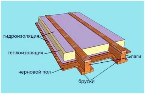 - Кроме того при обработке деревянных лаг защитными составами, пар, который неизбежно образовывается в жилых помещениях, начинает их разрушать. А ватные утеплители смогут намокать. Особенно опасно, в случае если при утеплении употреблялись простые опилки (что достаточно распространено), громадна возможность образования в них плесени. Исходя из этого делать пароизоляционный слой советуют не только в ванных и на кухнях, но и во всех комнатах.
