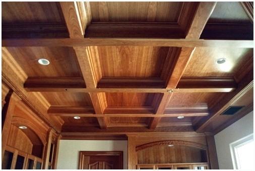 Таковой потолок скроет неровности потолка (либо вентиляционную систему) и послужит неповторимым украшением комнаты. Но цена кессонных потолков из дерева довольно высокая и зависит от породы дерева и сложности работы. А если вы выбрали недорогую древесину для потолка, то придать фактуре ясность и раскрыть ее красоту ещё больше возможно при помощи нанесения на кассеты, вагонку либо панели лака либо морилки. Как раз такая обработка придаст наиболее недорогим сортам древесины внушительный и элитный вид.
