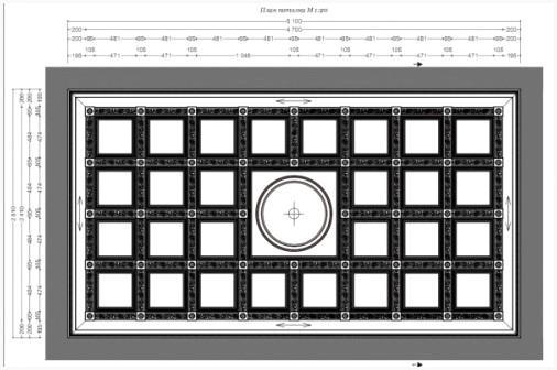 Для начала нарисуйте эскиз и определитесь с композицией будущего потолка. Помните учитывать высоту потолков в вашем доме и интерьер. Все должно быть гармонично и бережно. Чтобы выяснить, сколько материала вам необходимо для кессонного потолка, отыщите центр комнаты и создайте предварительный чертеж, нарисовав места размещения плит.
