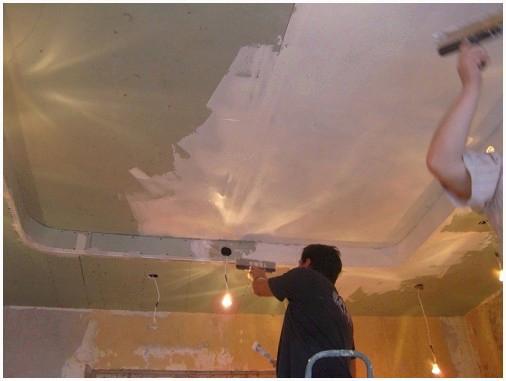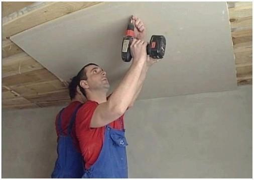 - Каркас под потолок не трогают, на него только прикручивают новые страницы ГКЛ 9 мм. Затевать работы направляться от угла комнаты. Делать это эргономичнее всего вдвоем, пока один прикручивает, второй поддерживает. Исходя из этого необходимо запастись козлами либо двумя стремянками.
