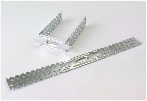 Направляющие крепятся к стенкам посредством дюбельных гвоздей. Предварительно профили нарезаются по размерам ножницами по металлу и снабжаются монтажными отверстиями с шагом 0,5м. После этого аналогичную операцию по сверлению необходимо выполнить перфоратором в стенке. Отверстия должны попарно совпадать. Через них крепим ряд профилей посредством молотка и дюбелей.