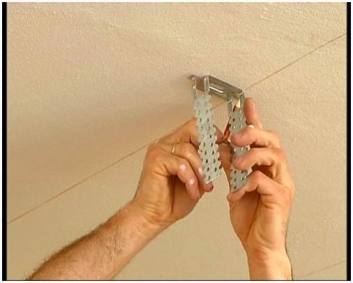 - По выполненной разметке к потолочной поверхности крепятся дюбелями железные тяги через каждые 0,9м на одной линии. Ход всех линий – не более 1м. Конечный ряд тяг находится на расстоянии 0.1м от стенки. Целый крепеж на потолке выполняются в шахматном порядке.