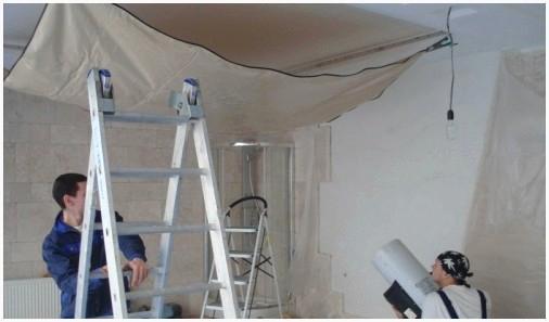 Технологический процесс разворачивания: базовый угол разворачивается, позже прогревается, цепляется к первой прищепке, потом неспешно раскрывается и цепляется к остальным прищепкам. Вот так натягивают всецело потолок. Весьма ответственным есть процедура проверки правильности постановки полотна. Для этого необходимы приблизители и прямые лопатки.