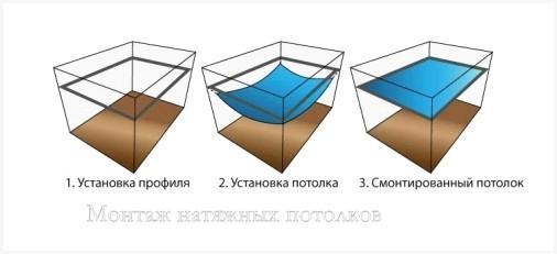 Существуют разные типы профилей для монтажа натяжного потолка: для крепления с минимальным занижением потолка, для закрепления на стены, для организации стыков полотен. Для крепления на стены натяжного полотна употребляются потолочные профили. Эта технология пока мало используется в России, но обширно — в Европе.