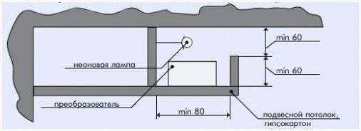 - Монтаж осветительного оборудования выполняется на любую базу. Так для оштукатуренных поверхностей употребляется полистирольный плинтус, в гипсокартонных, подвесных и натяжных основаниях обустраиваются ниши, оптимальный размер которых образовывает: 20х50х70 мм. При расчетах принципиально важно учитывать габариты преобразователя напряжения.