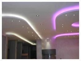 - Для потолка из гипсокартона с подсветкой потребуются отдельные ниши в конструкции. Для работы неоновой продукции нужен преобразователь, который повышает частотность электротока. Направляться знать, что один трансформатор обслуживает до семи метров трубок.