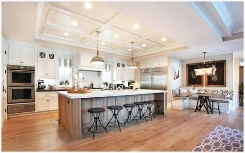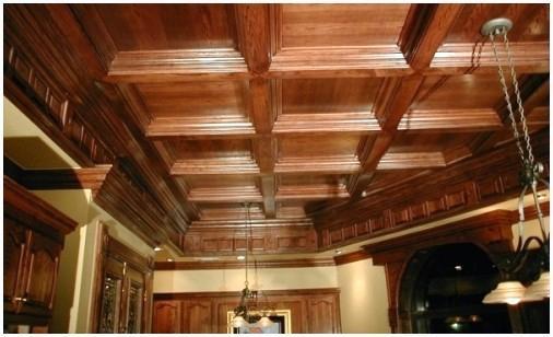 Существует еще один вариант отделки потолка с балками, более изысканный и более дорогой – декорирование посредством создания кессонов. Данный потолок складывается из потолочных балок, ячеек, бордюров, карнизов и углублений. Причем кассеты смогут быть квадратными, ромбовидными либо многоугольными. В практике дизайна интерьера кроме этого известны круглые кессоны.