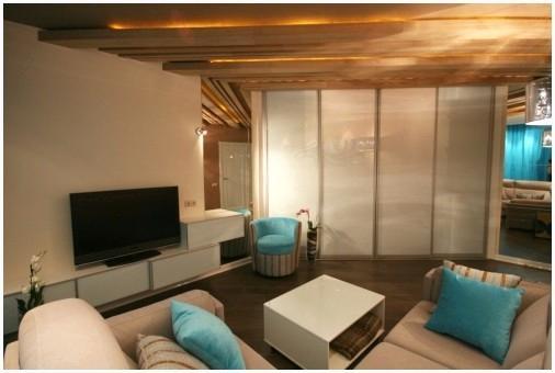 - Неприятность низких потолков. В случае если в вашем жилье давит грузом низкий потолок, то для корректирования данного недостатка возможно попытаться таковой прием. Балки с потолка должны переходить на стены. По стенке наряду с этим может идти и не совсем балка, а узкая планка в тон балки.