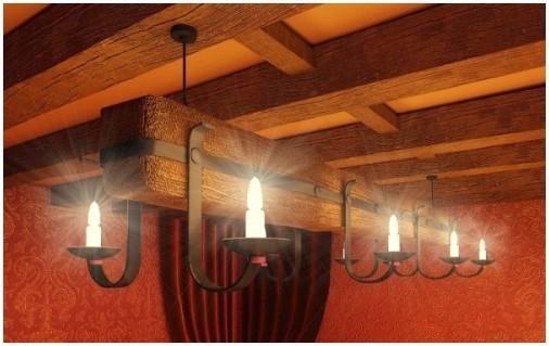 - Необыкновенное освещение. На самой обычной потолочной балке возможно закрепить встаиваемые светильники, светодиодную подсветку, подвесить либо подвязать к ней на цепях громадные люстры. Балки часто применяют для оформления ниш в конструкциях из гипсокартона и создания точечного освещения.