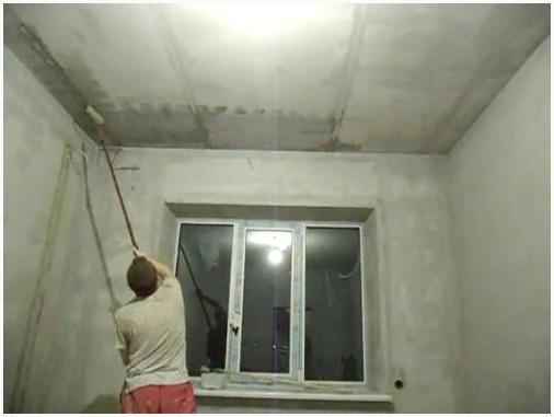 - По всей площади потолка наносится клеевой слой, который выполнит роль грунтовки. Он предотвратит впитывание последующего связующего слоя. Направляться подождать, пока он не высохнет всецело;