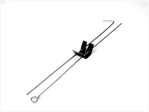 - Подвес – представляет собой две узкие спицы, одна из которых имеет кольцо с отверстиями для дюбелей, благодаря которым элемент закрепляется в плите перекрытия, другая спица имеет на конце крюк, для удержания гребенки. Между собой спицы закреплены пружиной, которая помогает для регулировки высоты. Элемент может закреплять реечный потолок на расстоянии от несущей конструкции от 12 см до четырех метров;